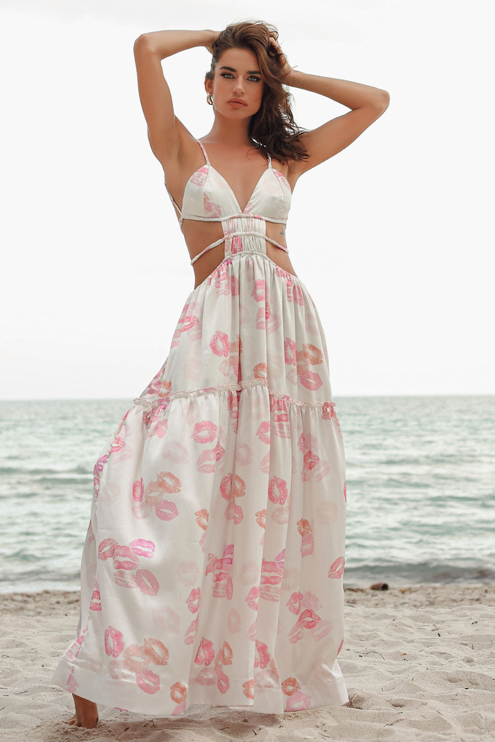 This long dress features a deep V-neckline, adjustable straps, detailed elasticated waist, pockets and a tiered skirt.