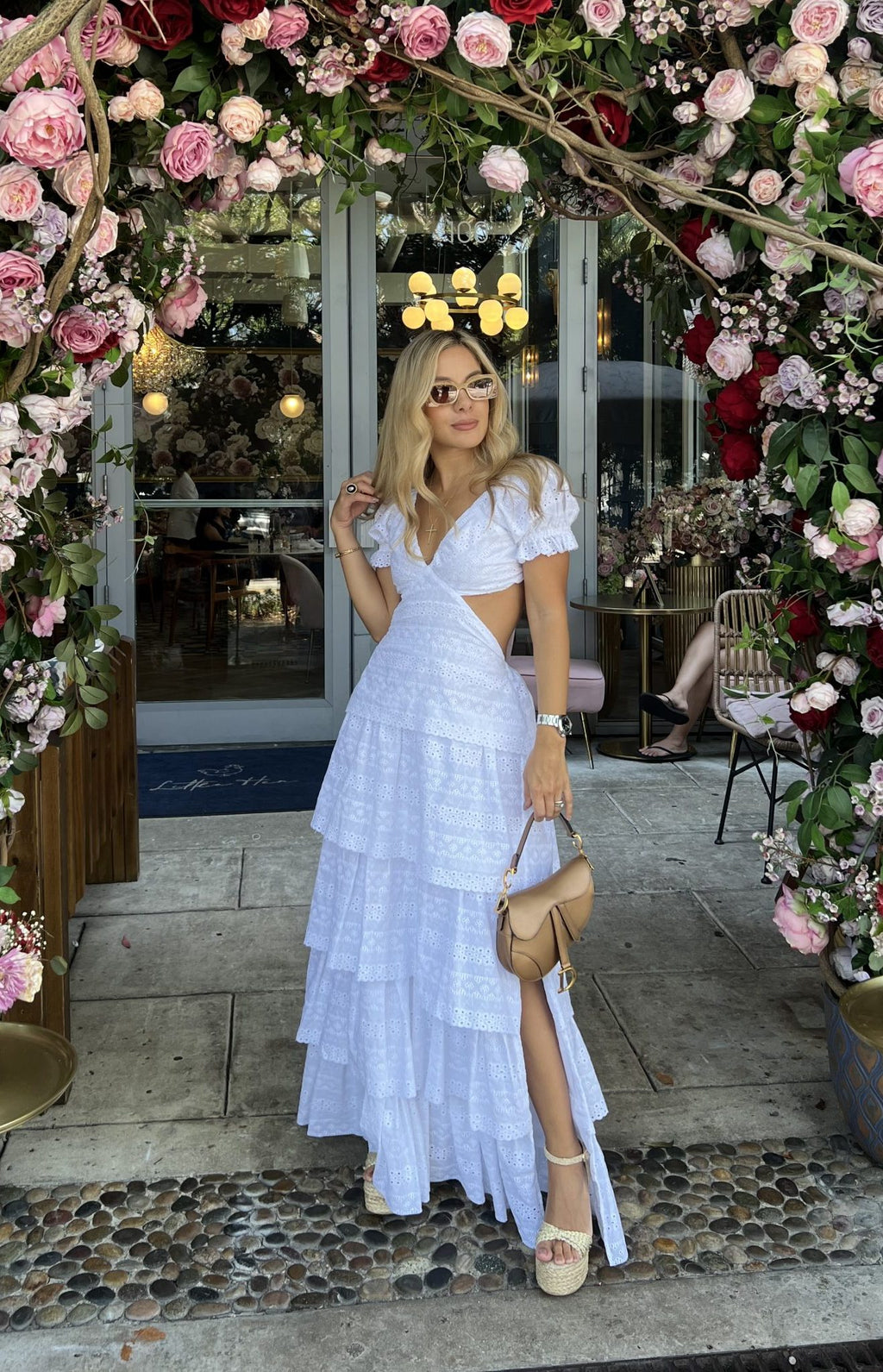 This beautiful long dress features a sweetheart neckline, short puff sleeves with elasticated cuffs, and a skirt with layered ruffles.