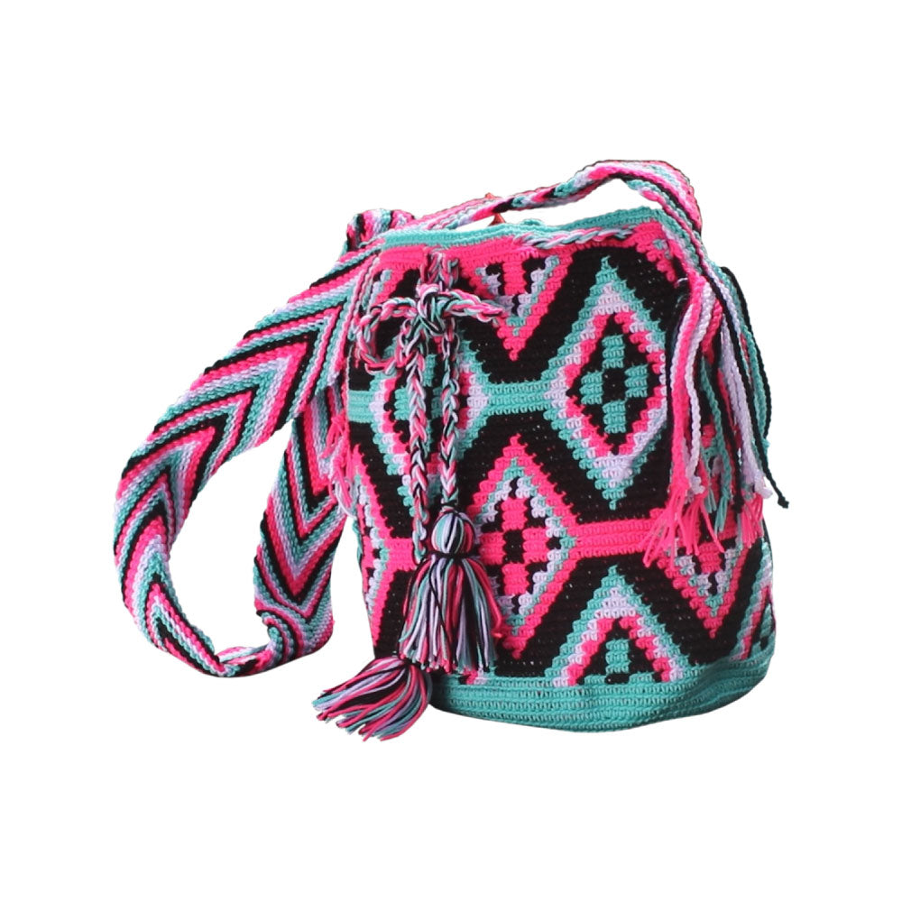 The Pink & Turquoise Mochila is a completely unique piece, handcrafted by indigenous artisans in Colombia. This style of bag is woven/knitted in multiple colors and patterns.