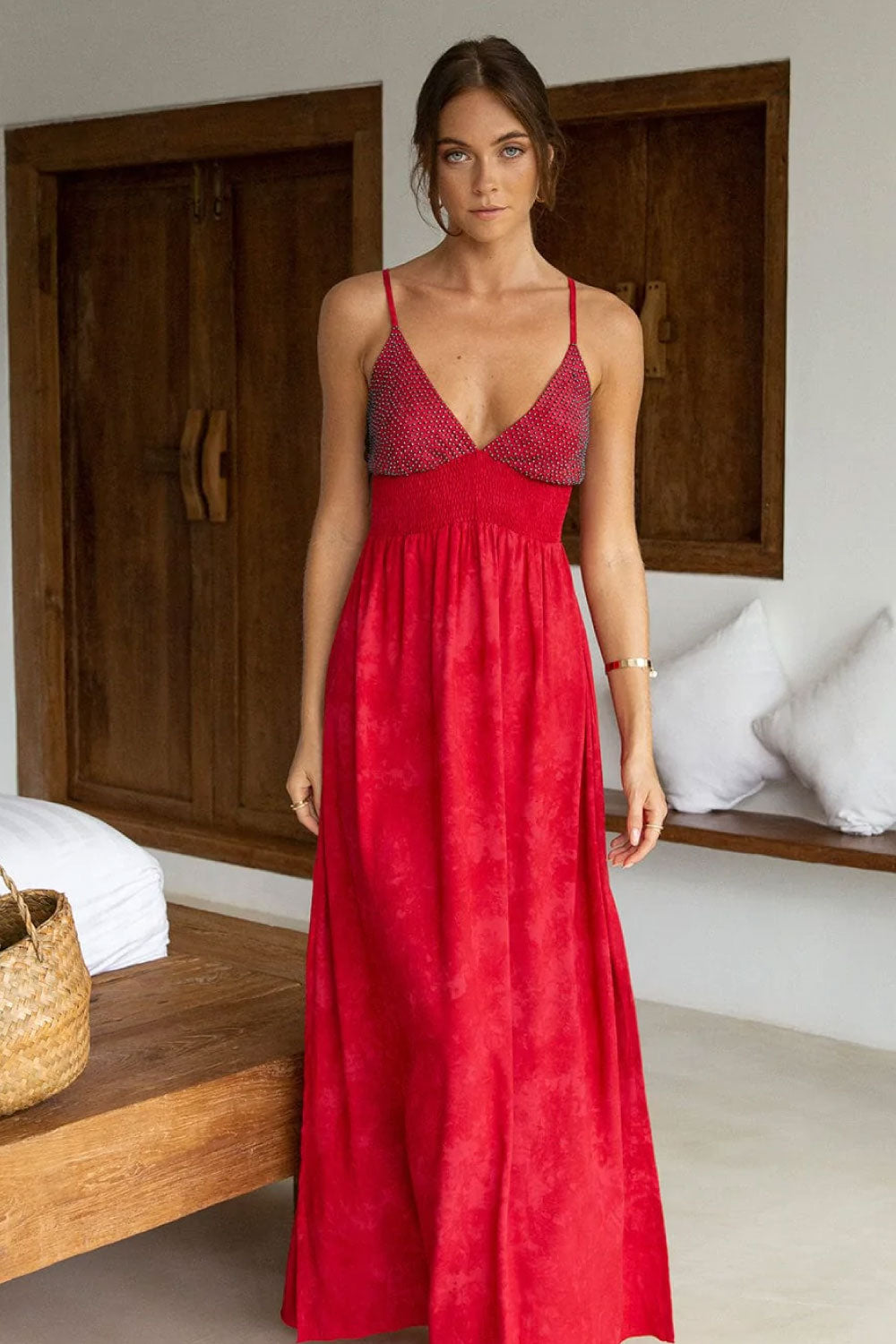 This sensational bohemian dress is sure to turn heads with its V-neckline and beaded triangle top, wide smock under bust, elastic back and alluring side slits.