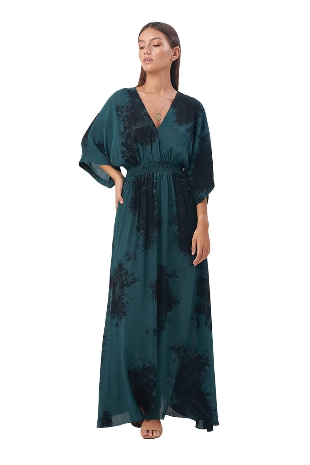The Poppy Caftan Maxi Dress features a floor-length caftan silhouette with a V neck, relaxed ¾ bell sleeves, and an empire waist for some much-needed structure.