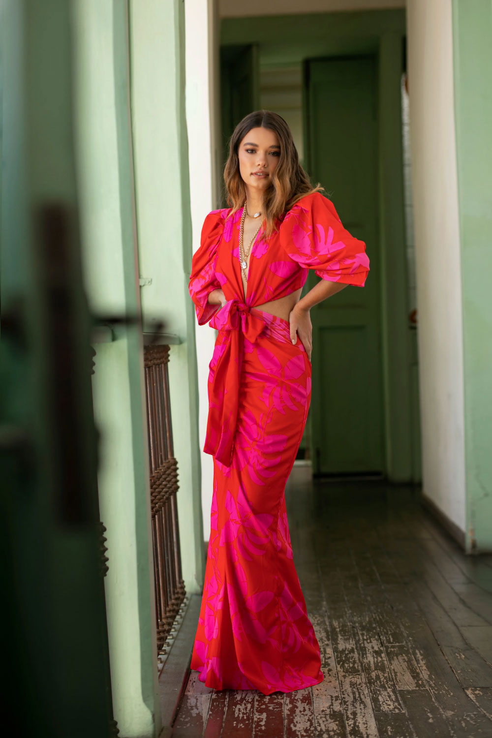 This beautiful dress is sure to bring out your inner mermaid! Incorporating stunning shades of pink and green, this dress features a deep V-neckline, bold sleeves, and a sexy slit in the skirt.