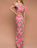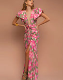 This beautiful dress is sure to bring out your inner mermaid! Incorporating stunning shades of pink and green, this dress features a deep V-neckline, bold sleeves, and a sexy slit in the skirt.