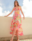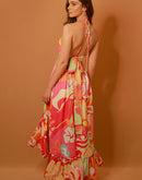 This midi dress features a deep V-neckline, straps to adjust collar and waist, a decorative buckle, a skirt with ruffles and an elasticated back to adjust.