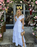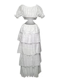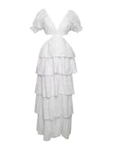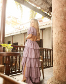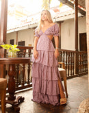 This beautiful long dress features a sweetheart neckline, short puff sleeves with elasticated cuffs, and a skirt with layered ruffles.