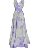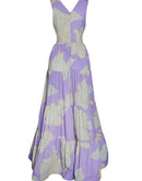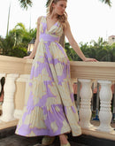 This beautiful midi dress features a deep V-neckline, a waistband with draped detail, and an invisible zipper in the center back.