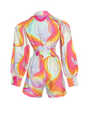 This long sleeve one-piece jumpsuit features a sexy, deep neckline, flirty shorts, and a slider in front center and elastic in waist.