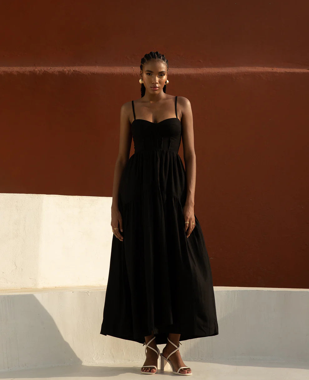 This long dress features a structured hem, sweetheart neckline, low-cut back, and gathered detail with elastic at the waist.