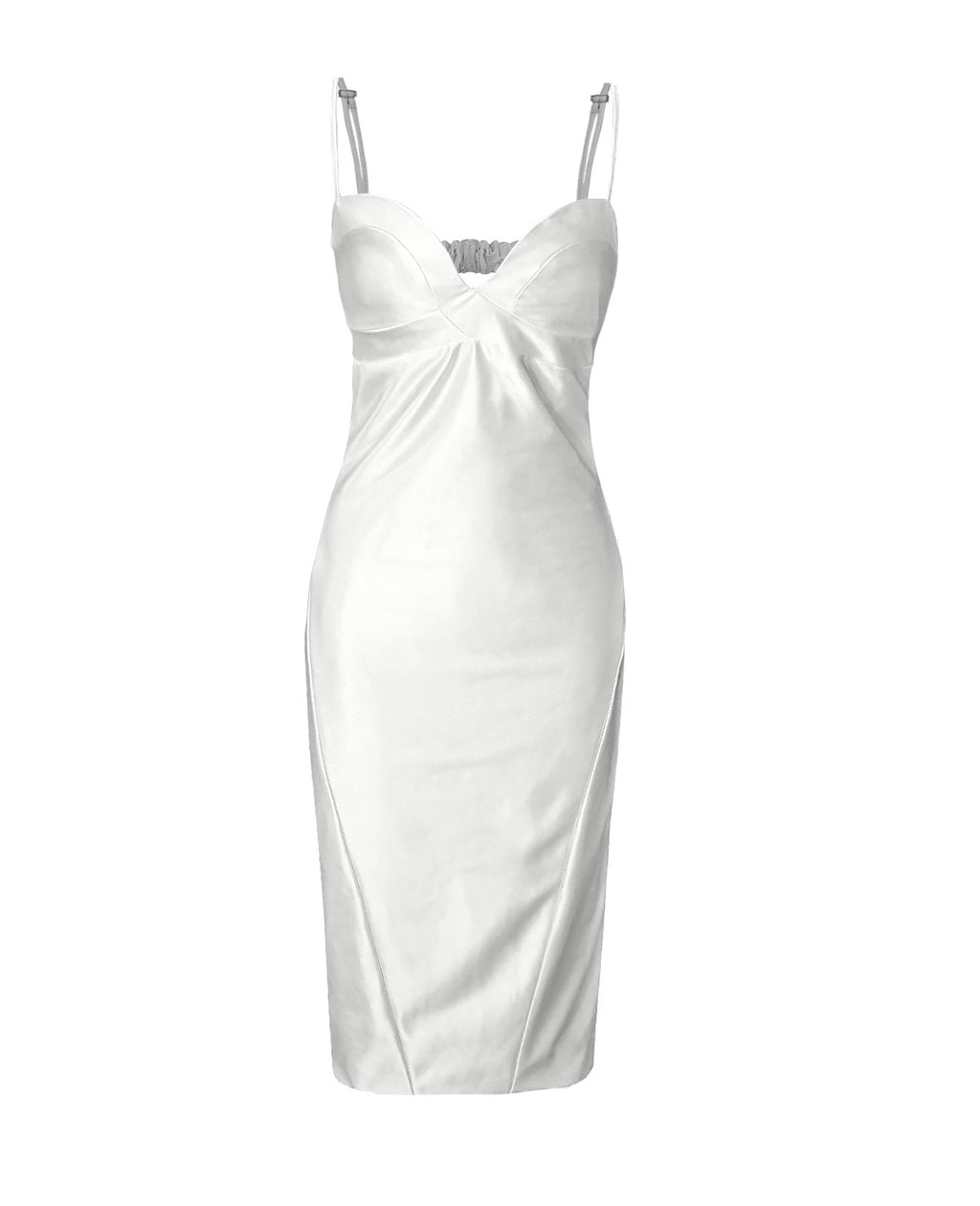 Ankle-length dress, with asymmetrical cuts to create a nice fitted AND draped silhouette.