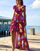 With its deep pink base, bold floral pattern, and luxurious details, the Hortensia high-low dress is perfect for your next big event. The cap sleeves and tapered skirt are figure-flattering, while the deep neckline and waist details add a touch of class.