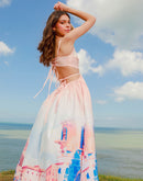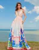 Maxi dress, top deep V neckline, adjustable straps, back straps corset type, structured skirt líne A.