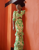 A piece of impact, represents realism magical, the detail of the tiered skirt, in the front a draped knotted neckline make it a versatile piece. The long sleeves give a glamorous style.