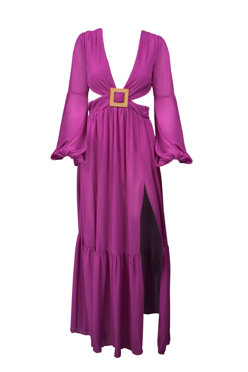 This long dress features a vaporous silhouette that turns to show an open back, a wide and elastic waist, long straps to cross in the back, and tie at the waist.