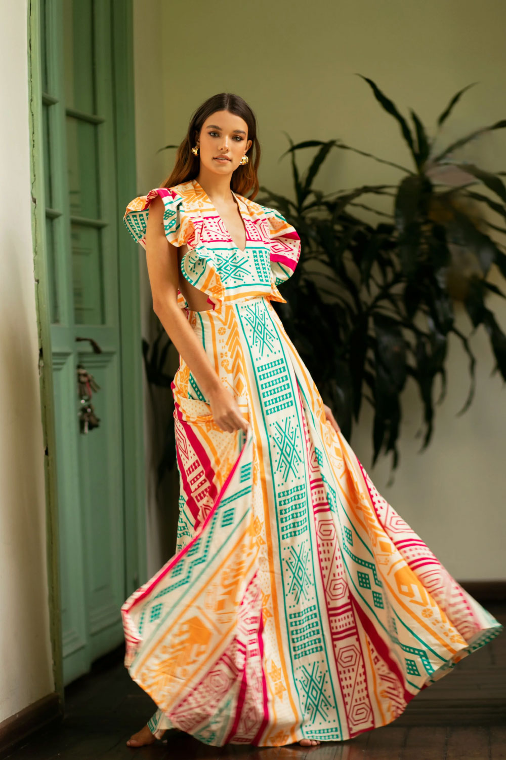 This floor-length dress from Mar A Mar will add a touch of class to your vacation wardrobe. The unique pattern is a perfect mix of white, turquoise, bright yellow and magenta. The flowing sleeves and skirt make it the perfect p...