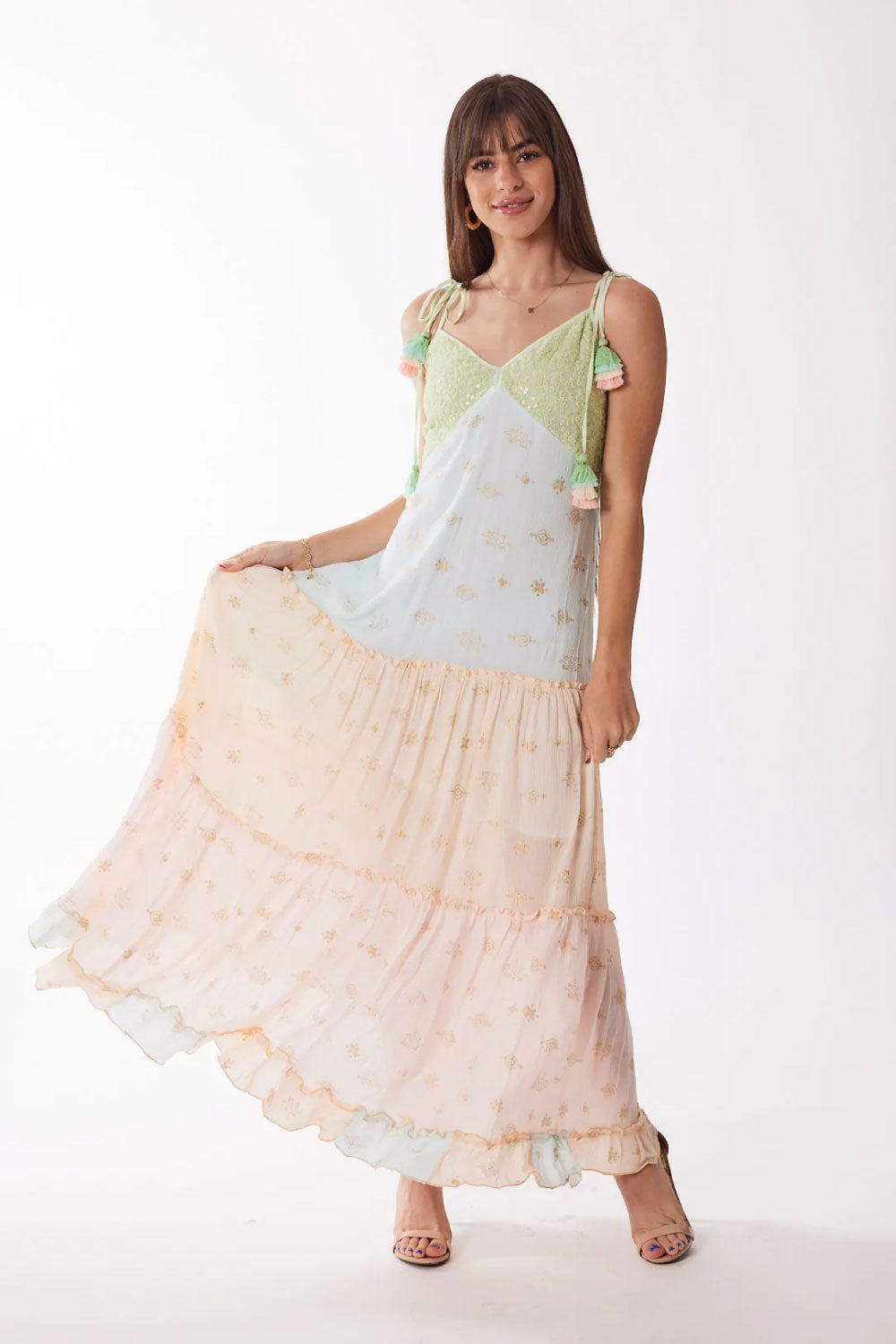 This beautiful pastel dress, featuring tassels and gold detailing, is lightweight and perfect for the spring and summer months!