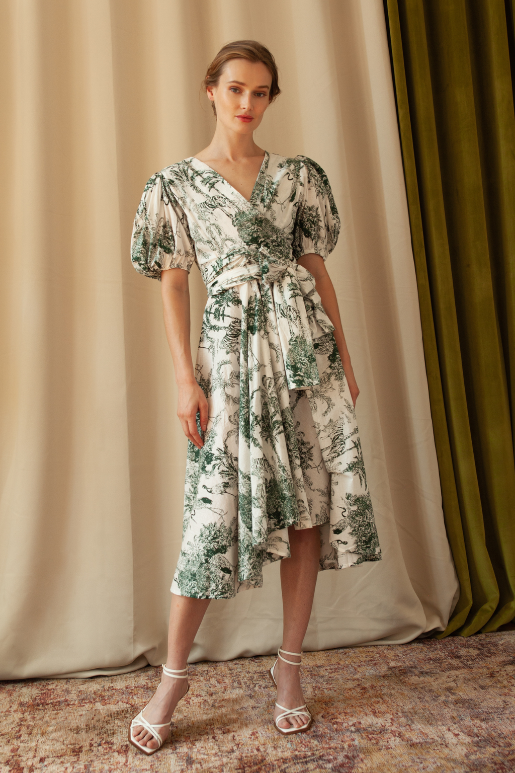 This beautiful midi dress features a deep V-neckline, a waistband with draped detail, and an invisible zipper in the center back.