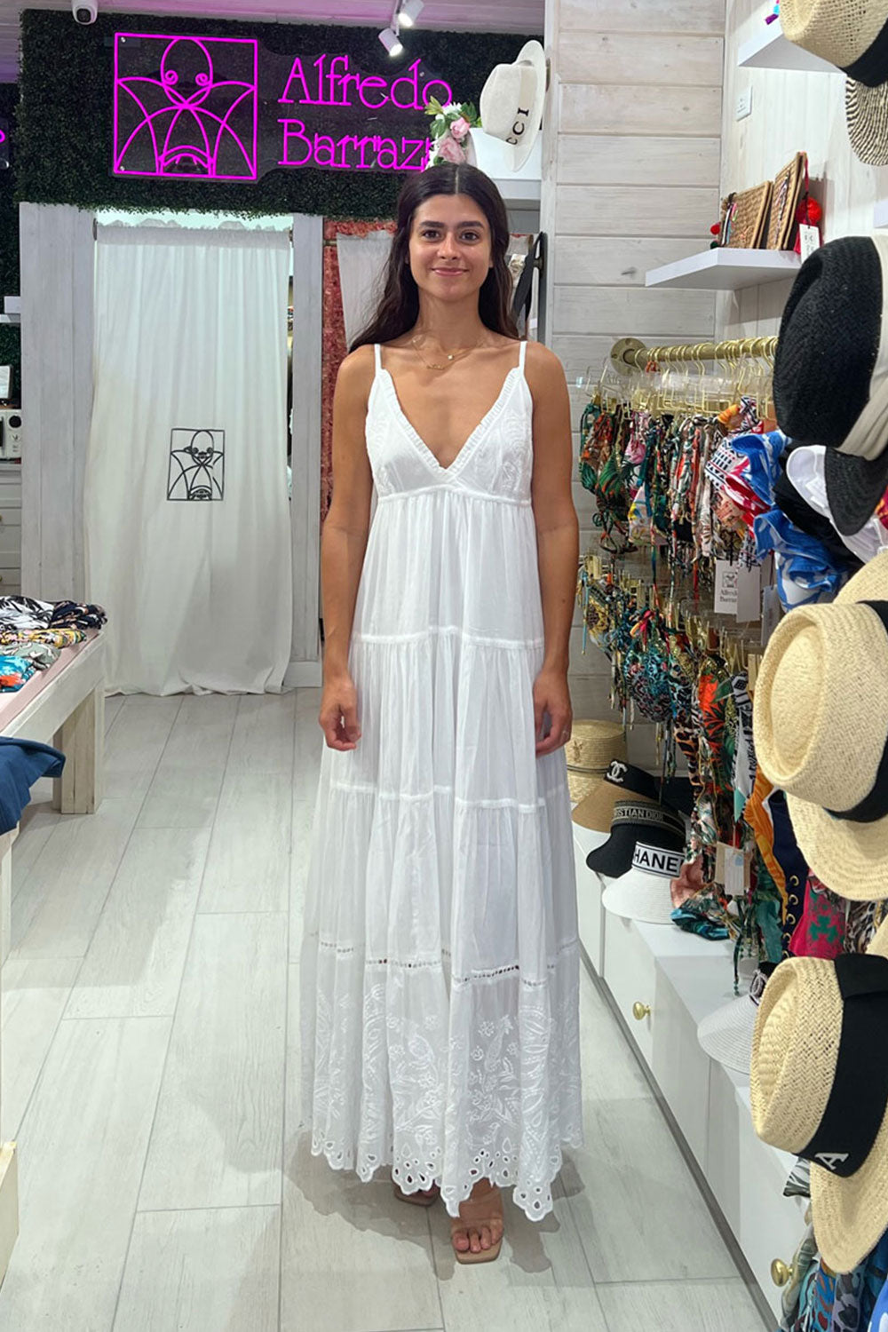 Light airy dress with floral detailing at the bottom and on the chest. Perfect for any beach day.