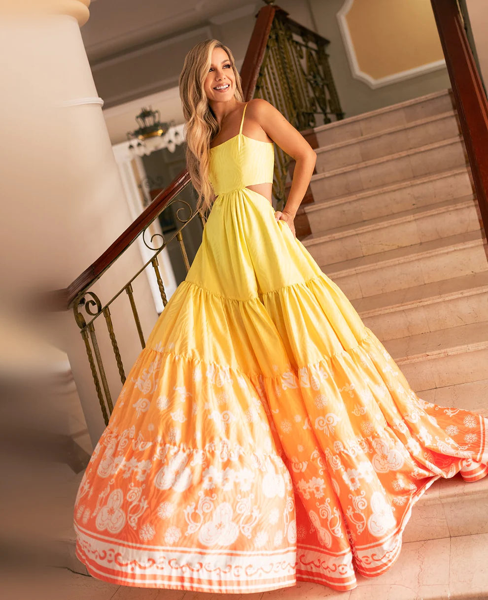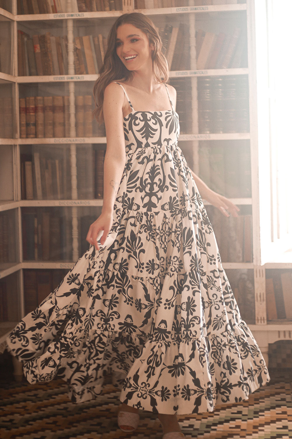 This long dress dress features a straight neckline, straps with adjustment in the back, skirt with layered ruffles and is structured with side pockets.