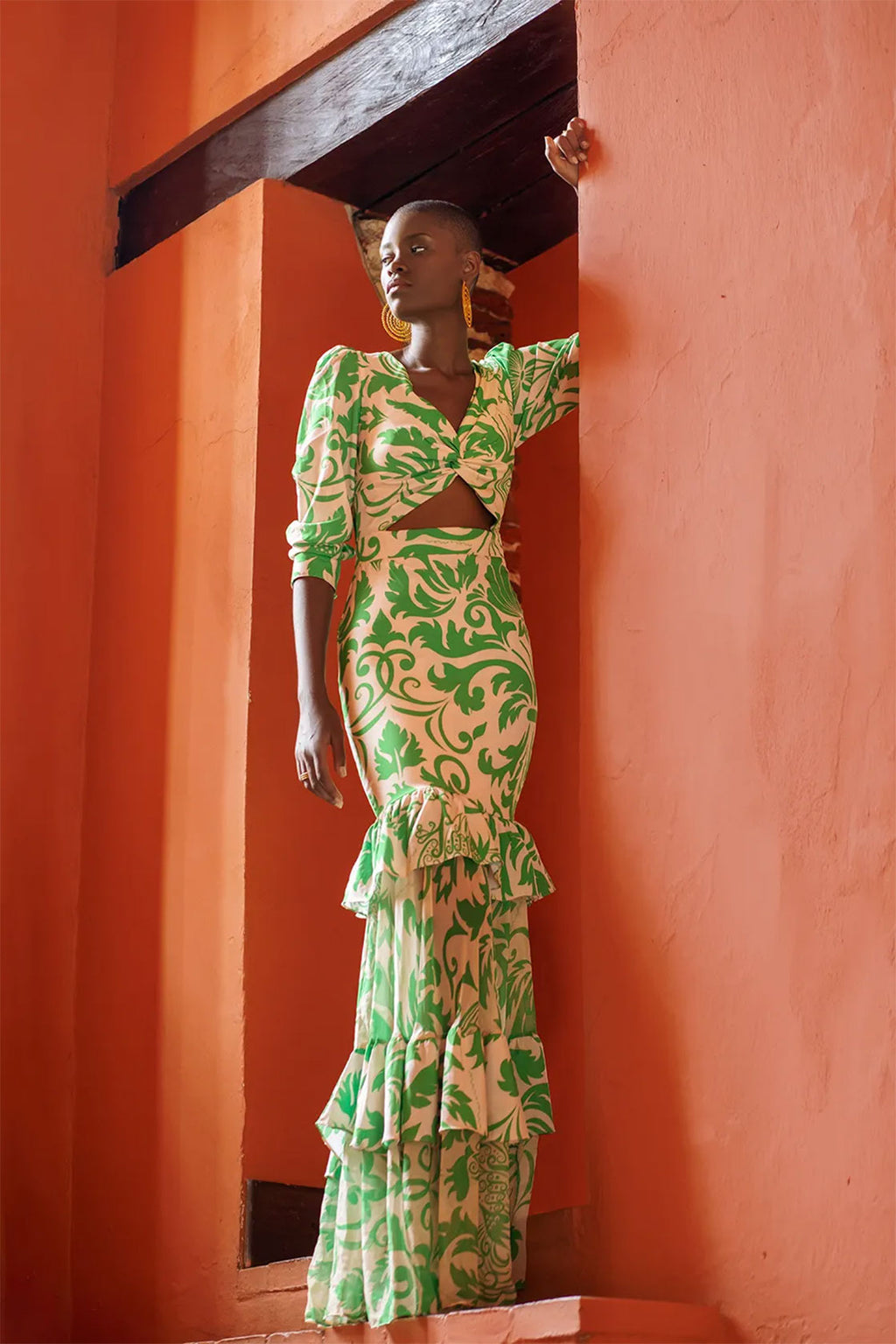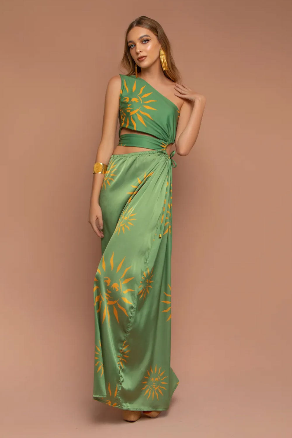 Featuring depictions of the sun, this silky, green dress is bohemian in pattern yet sophisticated in cut. Pair with your favorite pair of gold hoops and you'll be ready to head out the door.