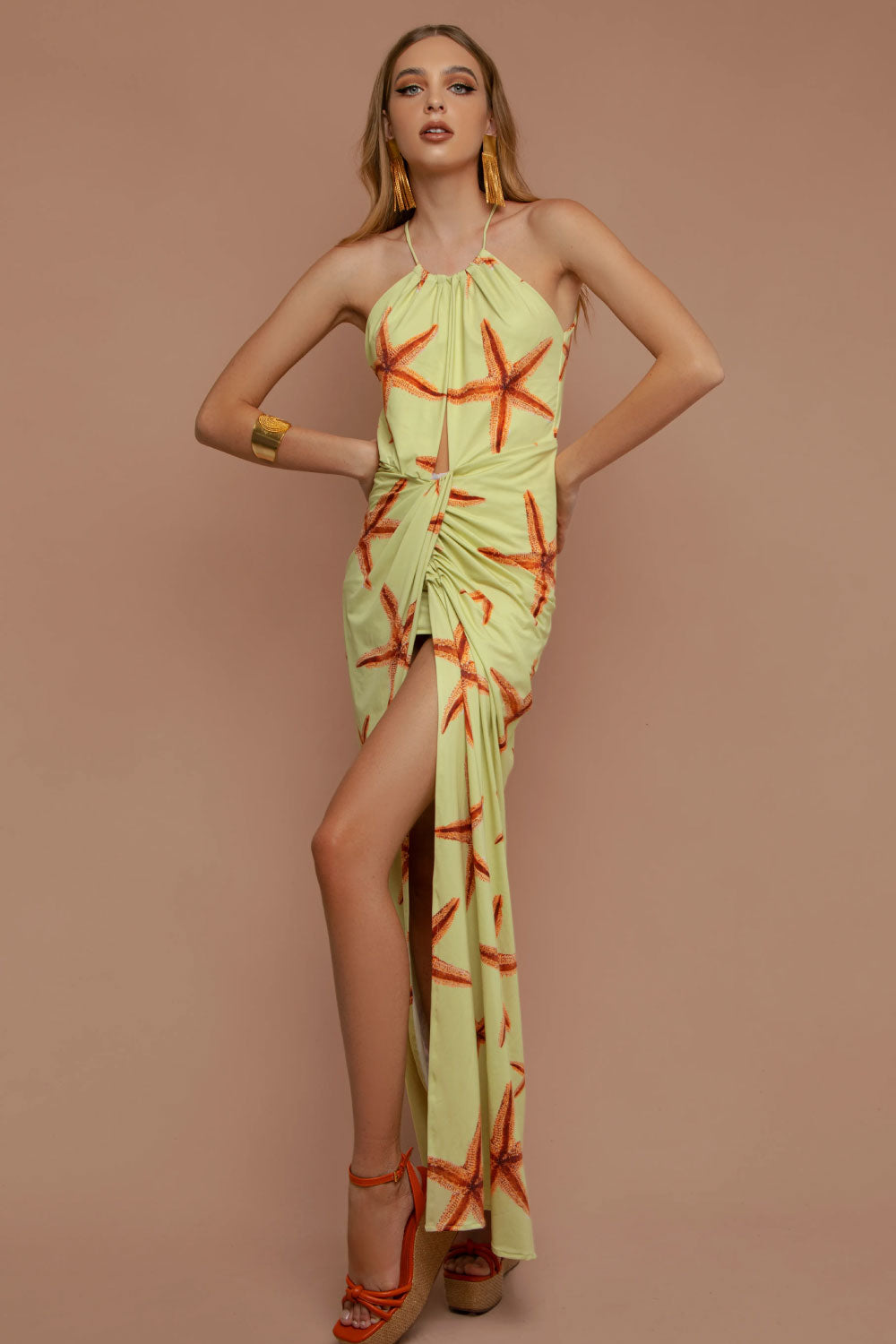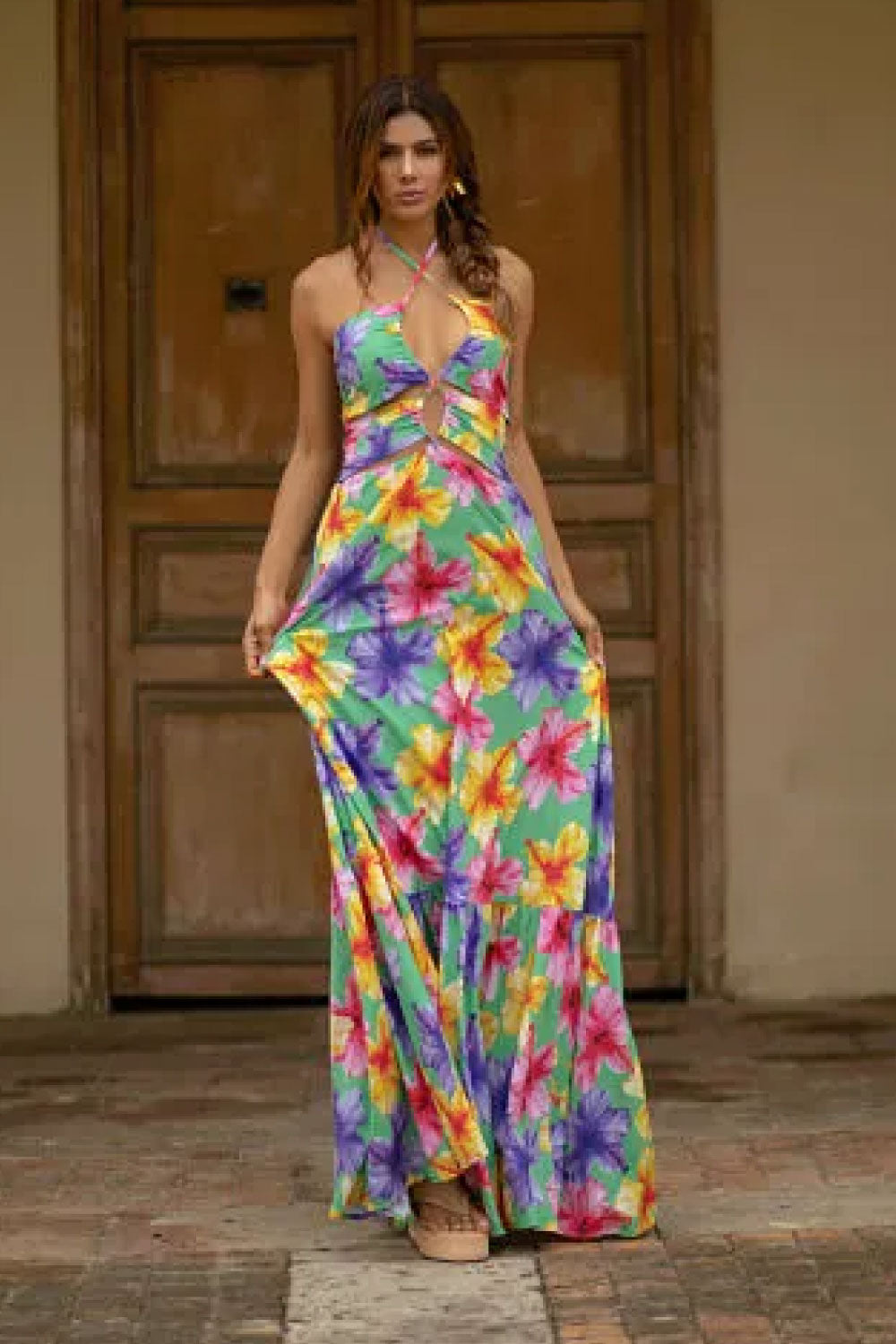 This long dress, featuring a bright, tropical print and intriguing neckline, is guaranteed to become your new favorite piece!