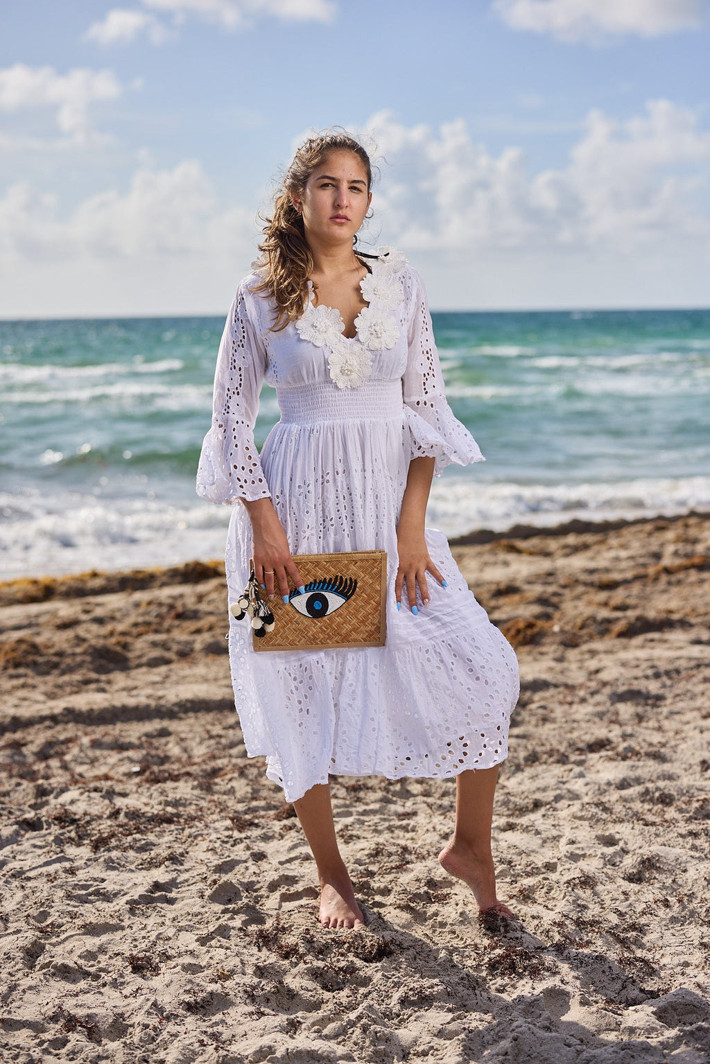 This lovely beach dress is made with 100% cotton and is the perfect blend of comfortable fabric with a touch of irresistable elegance.