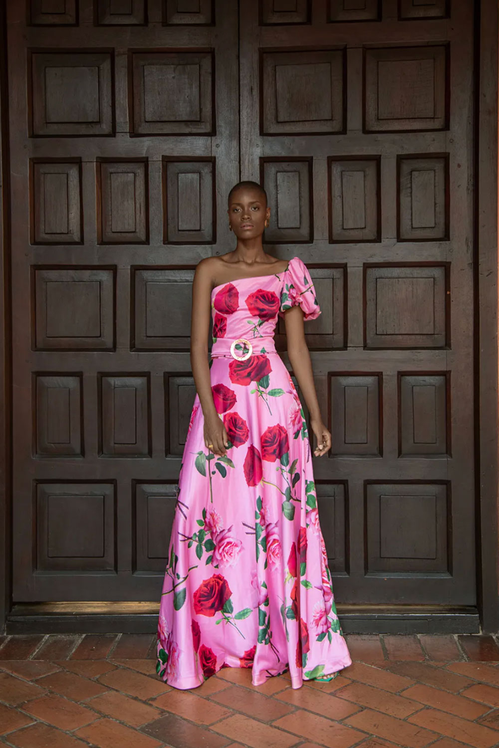 The most beloved, the life dress steals all looks represents femininity and romanticism with its print of roses, manga in a single shoulder, belt built-in to define the waist