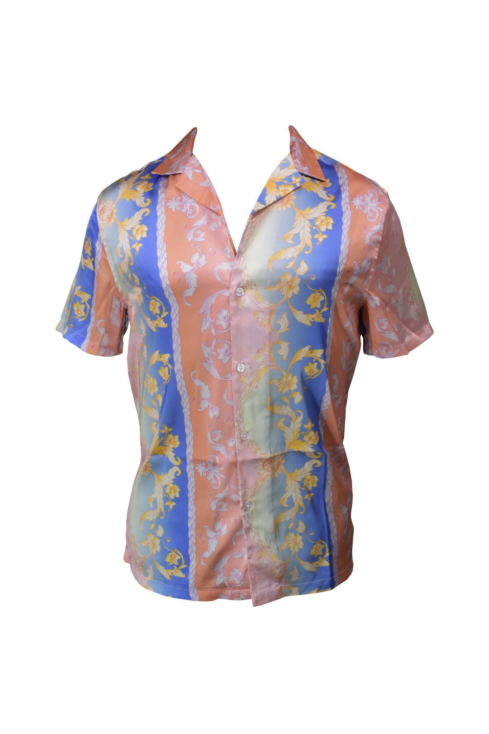 Hit the town in style with the Gold Floral Button-up! With a scrolling gold leaf pattern and combination of peach and blue, this shirt is truly unique!