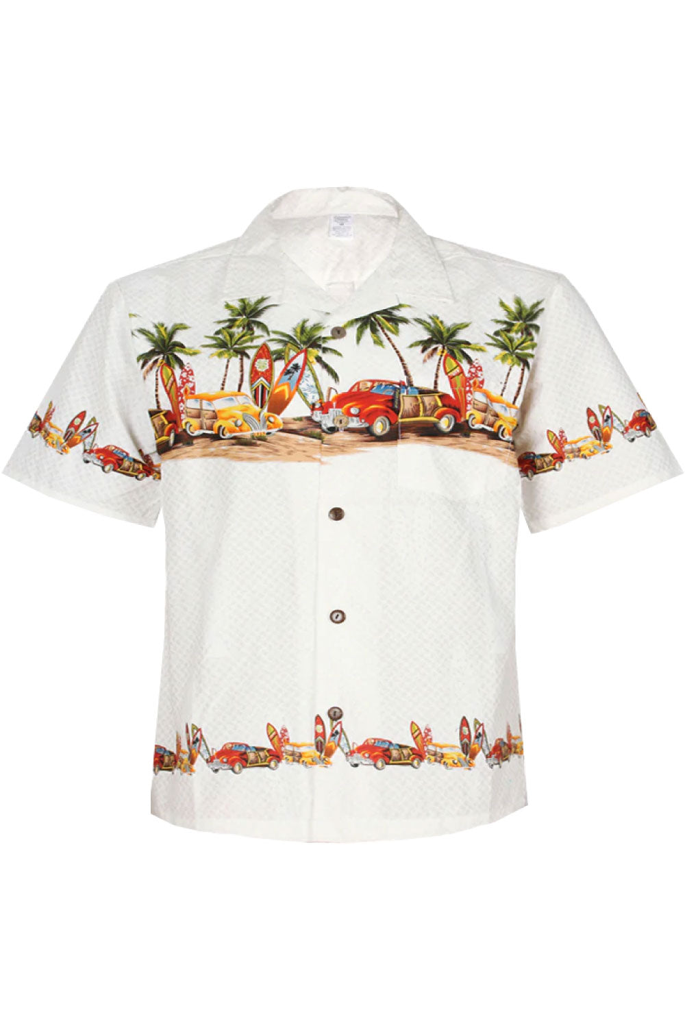 Kick off your summer in the Off White Vintage Car Aloha Shirt by Palmwave! Specifications: 100% cotton Coconut buttons Comfort fit — slightly wider for more comfort