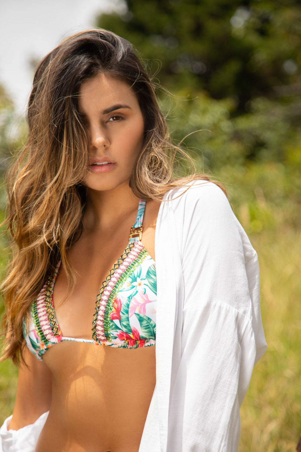 The stunning Santorini Bikini Set is sure to be your new go-to! With a beautiful blue leaf print, hand embroidery, and gold and pearled beading, you'll never want to take it off!
