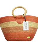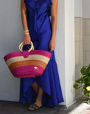 This straw bucket bag is completely hand crafted. Each individual strand of straw is hand dyed. The dyeing process is fairly lengthy, as the dye is mixed and watered down to create the exact color needed for every batch. The nature of the dye means that it may fade in time, and the blues may wear slightly onto your white tee. However, they come right out in the wash.
