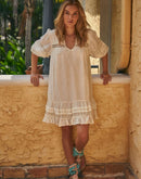This beautiful, lightweight dress is perfect for summer days! With crochet detailing and billowing sleeves, you'll be able to look stylish while remaining comfortable.