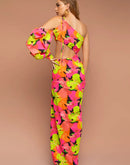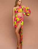 Giving the illusion of a two piece set, the Fiesta Dress makes a statement. With a sexy, high slit in the skirt and a one-sided, cold shoulder with a puffed sleeve, this piece is anything but predictable.