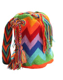 The Rainbow Chevron Mochila is a completely unique piece, handcrafted by indigenous artisans in Colombia. This style of bag is woven/knitted in multiple colors and patterns.